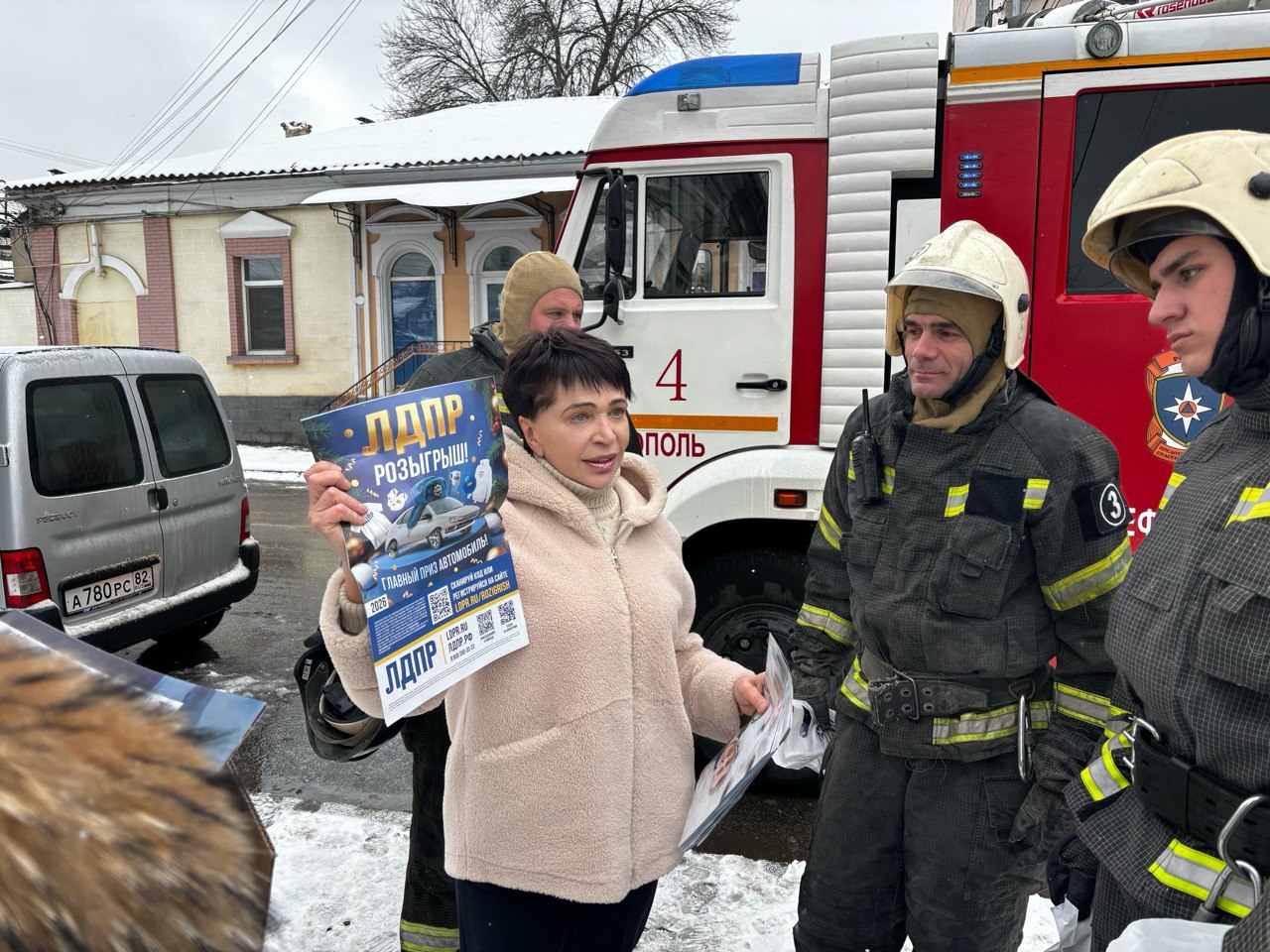 Поздравление стало для огнеборцев неожиданным сюрпризом — команда либерал-демократов встретила их сразу после ликвидации пожара на одной из центральных улиц Симферополя. Ещё несколько минут назад пожарные вели борьбу с огнём, а теперь получали искренние слова благодарности и памятные подарки.